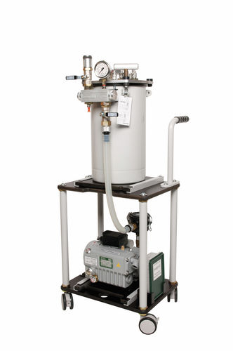 The MODULAR 2S is a single pump / single resin trap mobile vacuum system for manufacturing composites using processes such as resin infusion and vacuum bagging. The MODULAR 2S is based on a sturdy but light weight mobile docking cart. The bottom level of the cart will accommodate a range of vacuum pumps up to 28 m3/h in capacity with 230 V/50 Hz power, or 12.7 cfm with 115 V/60 Hz power. While there are a number of resin trap lid and vacuum control options for the resin trap on the upper level of the cart, the maximum resin catching capacity is always 12 litres (3.1 US gallons).