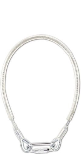 Connecting lanyard acc. to EN 354/EN 795 made of ∅8 mm zinc plated steel wire rope, with crimped terminations, protective tube and protective thimbles. Length 1m and 2m. For different lengths, please ask.